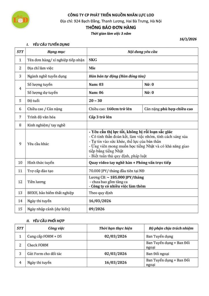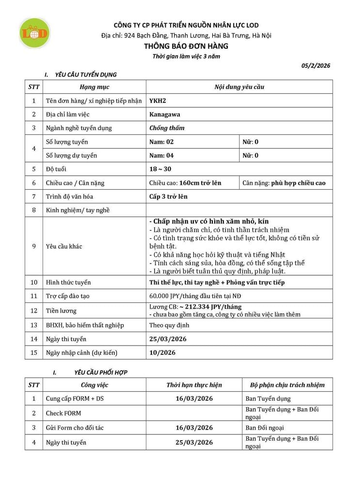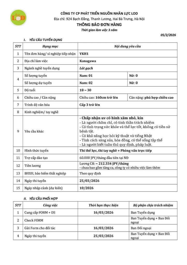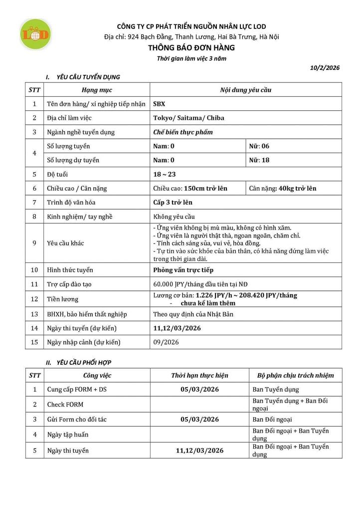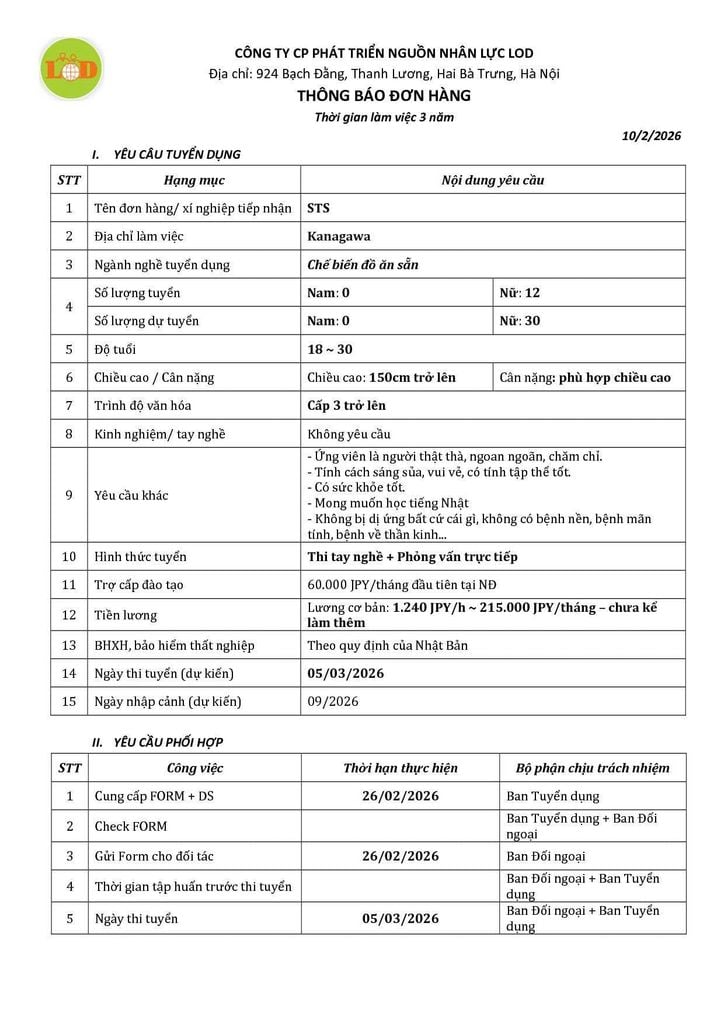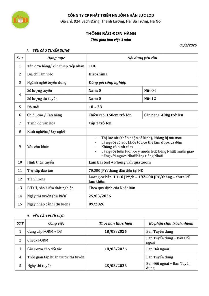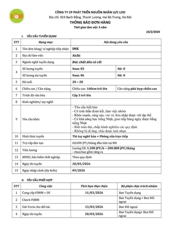 👉Hãy đến với chúng tôi: Công ty cổ phần phát triển nguồn nhân lực LOD – Top 1 Việt Nam trong lĩnh vực đưa Thực tập sinh đi làm việc tại Nhật Bản. Với các tiêu chí: