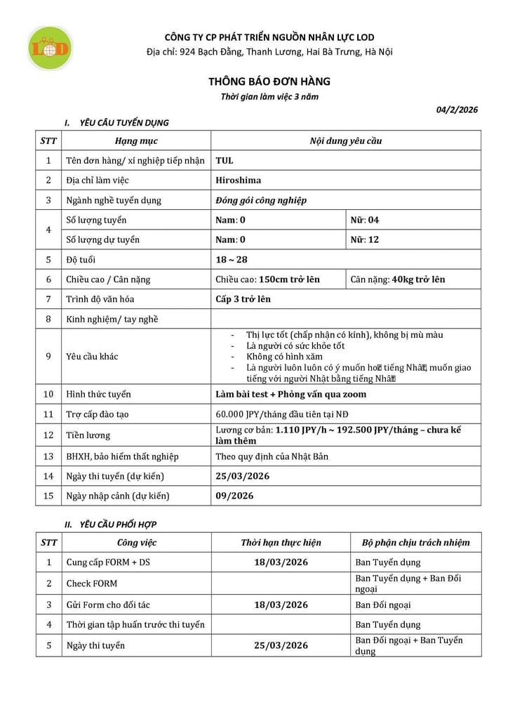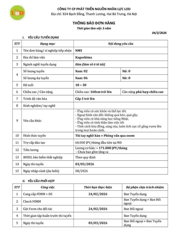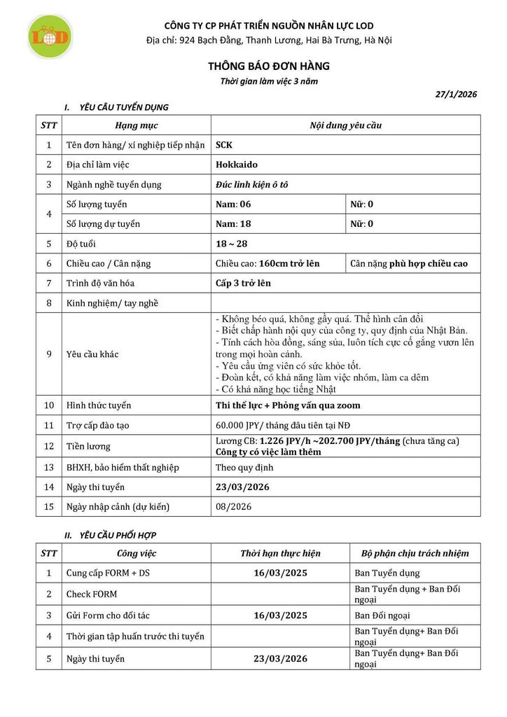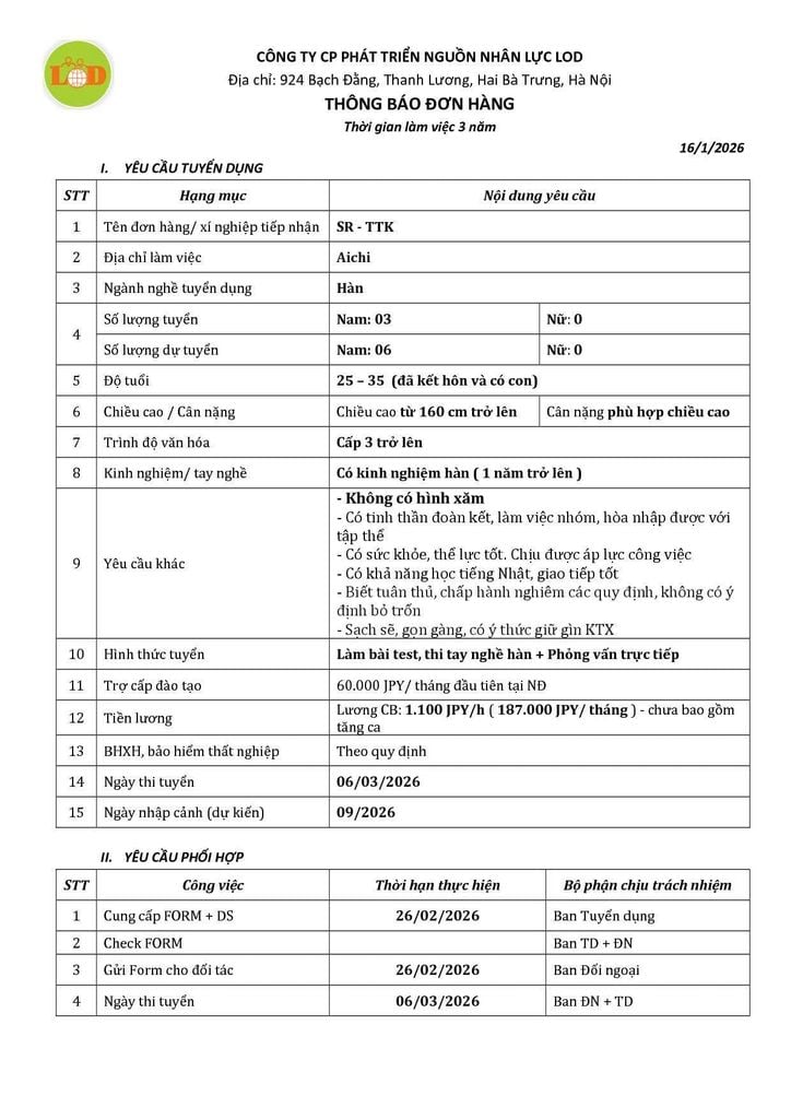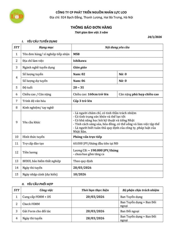 👉Hãy đến với chúng tôi: Công ty cổ phần phát triển nguồn nhân lực LOD – Top 1 Việt Nam trong lĩnh vực đưa Thực tập sinh đi làm việc tại Nhật Bản. Với các tiêu chí:
