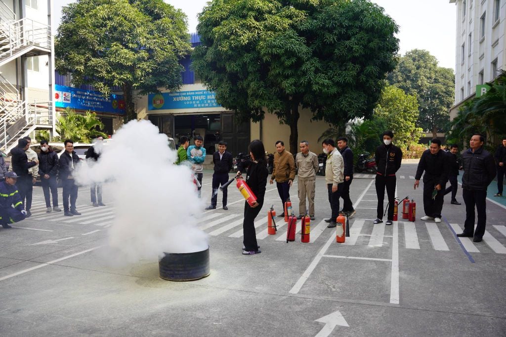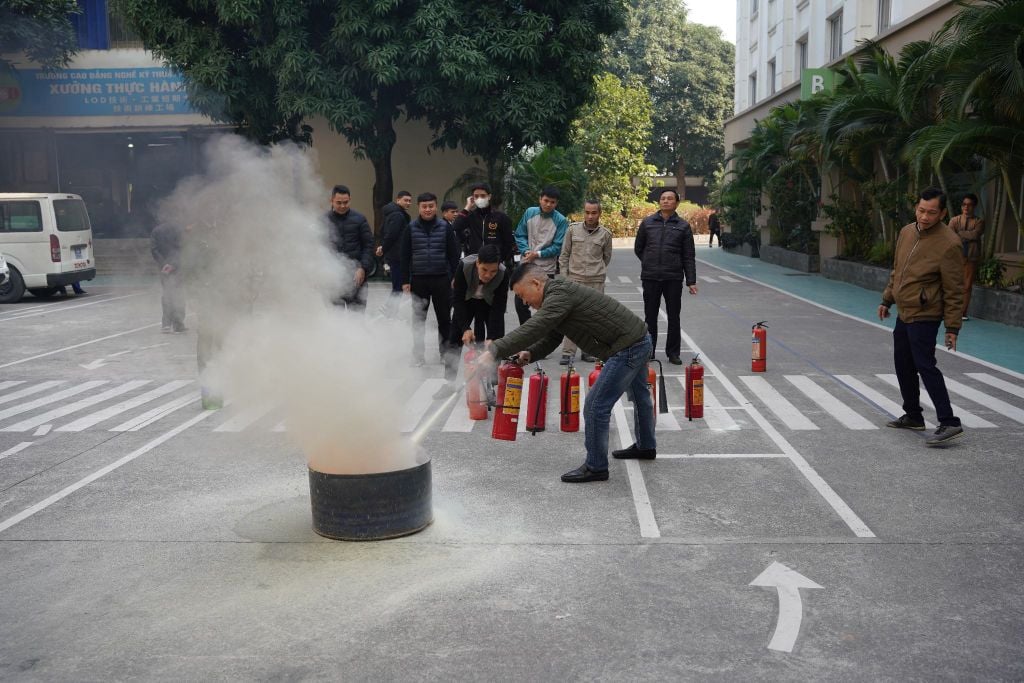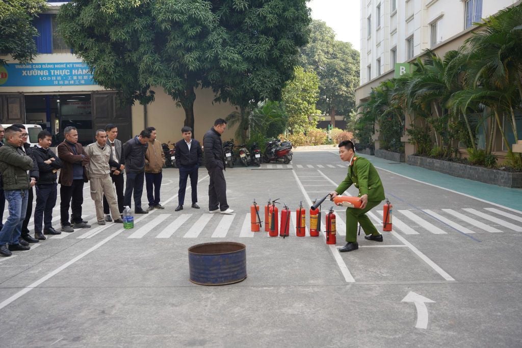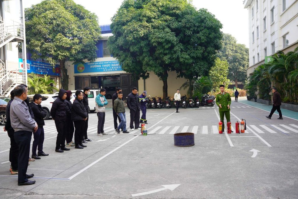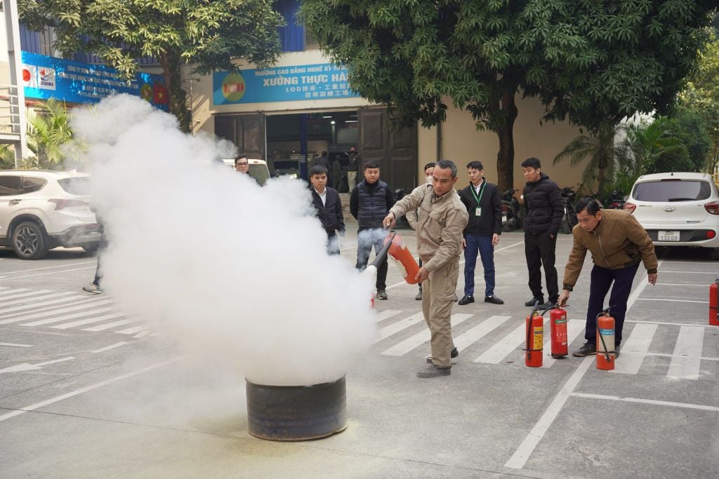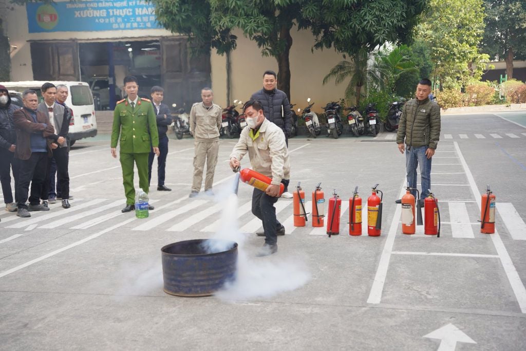 Sau phần lý thuyết, các học viên đã di chuyển ra khu vực sân bãi để trực tiếp thực hành. Dưới sự hướng dẫn tận tình của cán bộ chuyên trách, nhân viên LOD đã thực hiện thao tác rút chốt an toàn, hướng vòi phun vào gốc lửa và dập tắt đám cháy một cách quyết đoán.